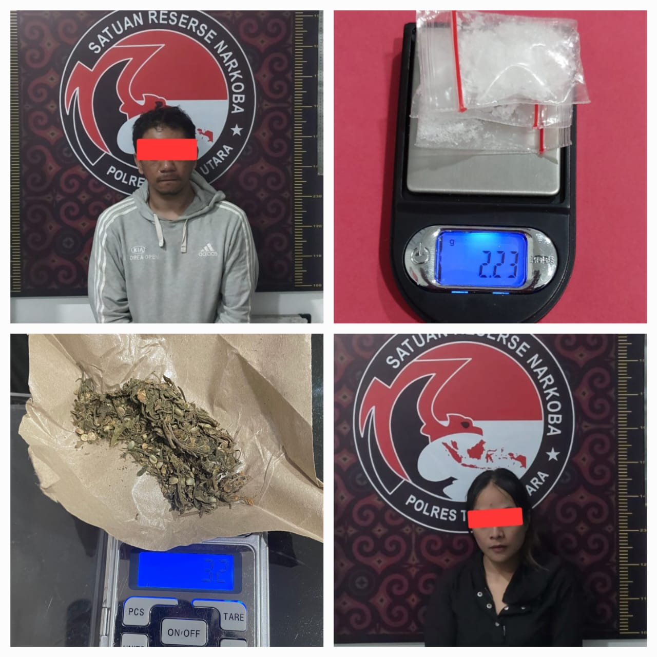 - Barang bukti: Tiga sachet plastik klip bening berisi sabu seberat 2,23 gram dan selembar tisu sebagai pembungkus.