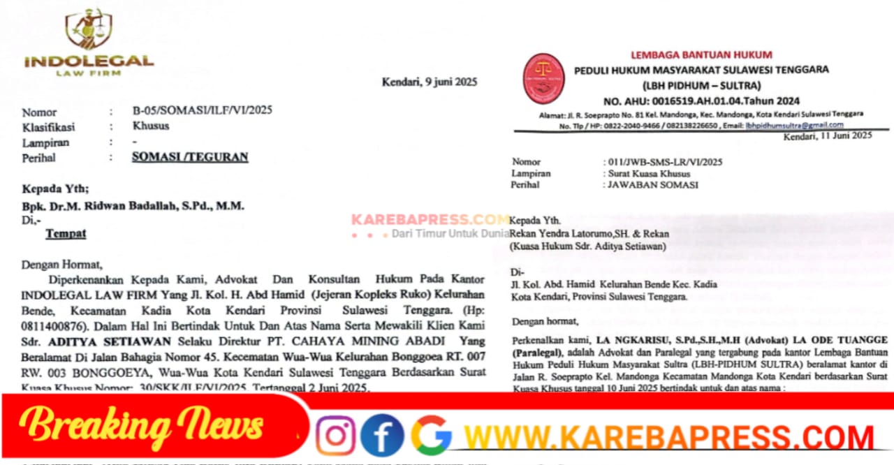 Menanggapi somasi yang dilayangkan kuasa hukum direktur pt cahaya mining abadi, Ridwan Badallah melalui kuasa hukumnya yang tergabung dalam LBH Peduli Hukum Masyarakat Sulawesi Tenggara ( LBH PIDHUM-SULTRA) juga memberikan jawaban dengan surat bernomor 011/JWB-SMS-LR/VI/2025, yang isinya membantah adanya perjanjian secara tertulis ataupun lisan dalam rangka menjanjikan sesuatu pekerjaan dengan Aditya Setiawan (direktur pt cahaya mining abadi), lanjut dalam jawaban somasi tersebut menerangkan bahwa Ridwan Badallah tidak pernah membuat perjanjian utang piutang melainkan hanya jasa yang di tawarkan oleh Direktur PT Cahaya Mining Abadi dalam proses Ridwan Badallah sebagai Pj Bupati.